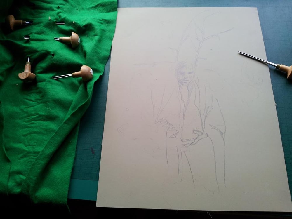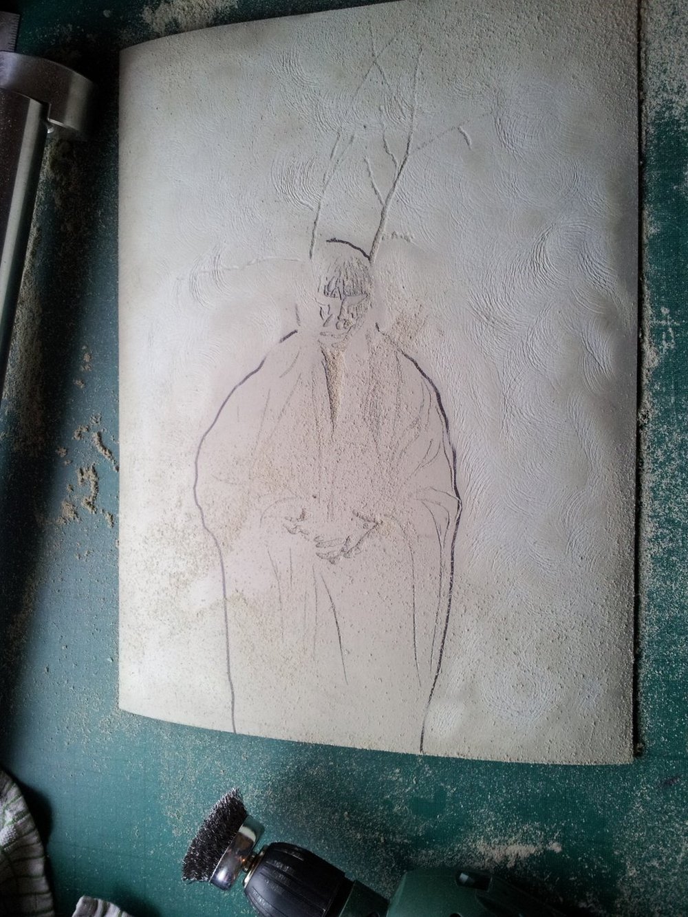 The central figure was cut with normal lino-cutting tools. The background is a combination of distressing the lino with a normal domestic power drill with a wire brush attachment, followed by selective etching with a solution of wallpaper paste and caustic soda.